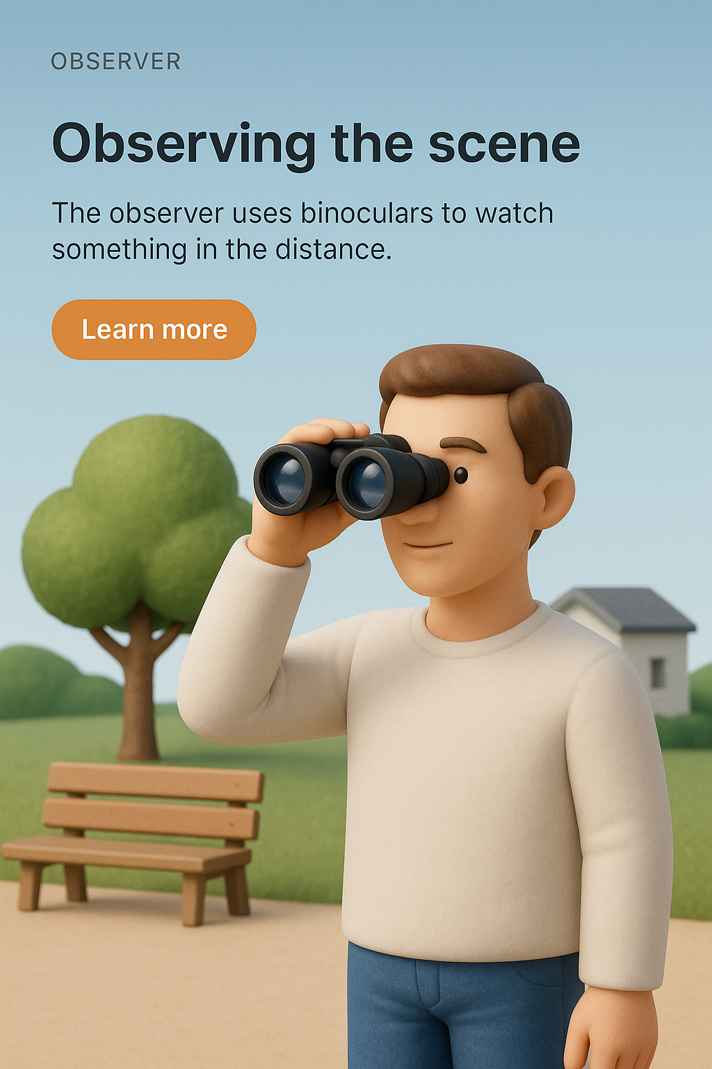 /Collection: /by davooda/Type: PNG/A detailed 3D illustration of an observer using binoculars to watch a distant scene. The background features a simple gradient with a park bench, emphasizing realism.