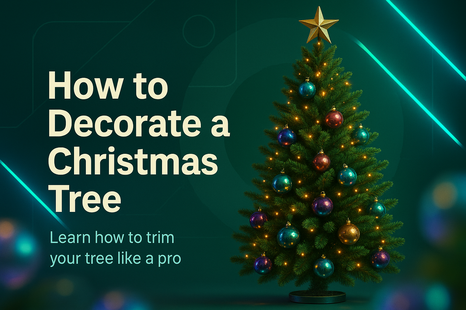 /Collection: /by davooda/Type: PNG/A visually appealing graphic showcasing a decorated Christmas tree with an informative guide on tree decoration. Ideal for holiday-themed content and social media.