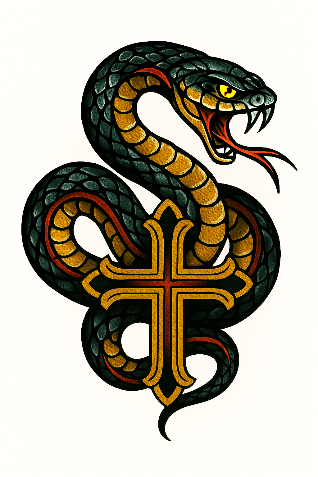A bold tattoo design featuring a snake entwined around a cross, showcasing vibrant colors and dynamic lines. Ideal for tattoo artists and enthusiasts.