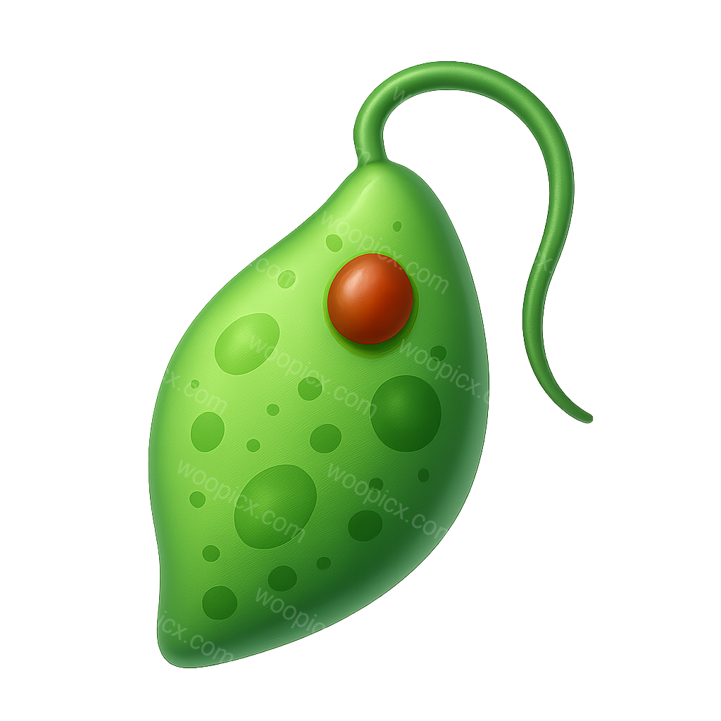 A vibrant 3D representation of a euglena, showcasing its green cell body with a red nucleus. The design features a three-quarter view with a smooth, glossy appearance and a transparent background.
