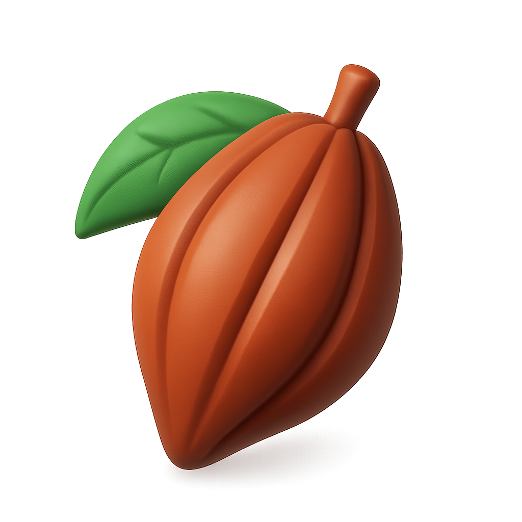 A visually appealing 3D icon of a cocoa pod with a green leaf, presented in a three-quarter view. The design features a smooth, volumetric look against a soft gradient background.
