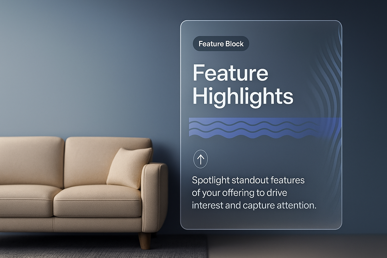 A cozy modern living room featuring a beige couch against a smooth gradient wall. A transparent feature block highlights key aspects, enhancing visual appeal.