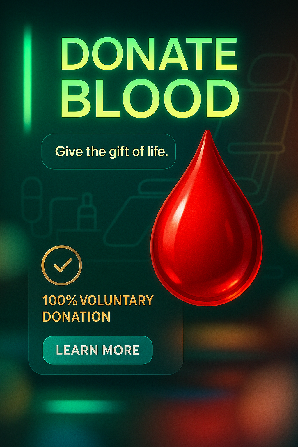 /Collection: /by davooda/Type: PNG/Vibrant promotional graphic encouraging blood donation, featuring a stylized blood droplet and bold typography. Ideal for health campaigns and social media outreach.