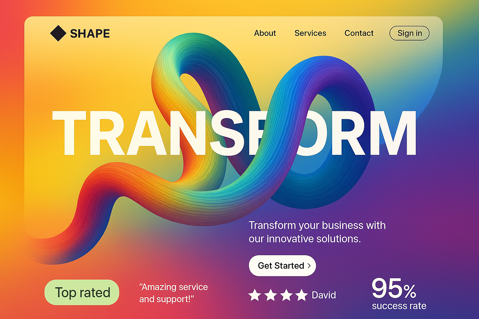 /Collection: /by davooda/Type: PNG/A vibrant landing page featuring a colorful geometric shape intertwined with bold typography. The layout includes sections for testimonials and key features, embodying a modern aesthetic.