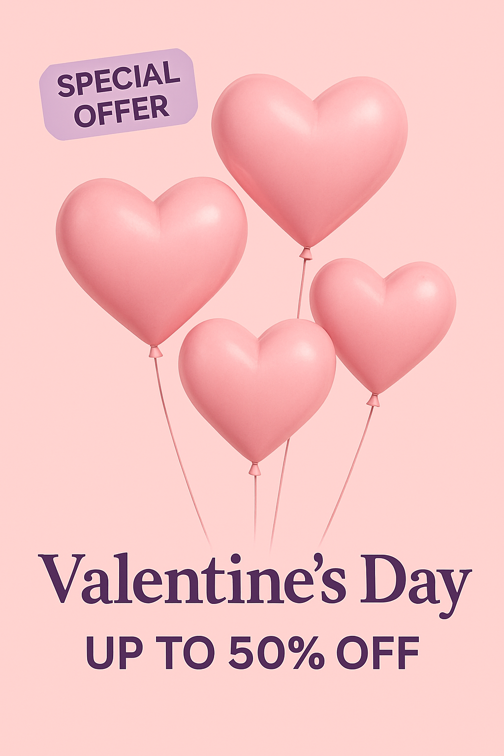 /Collection: /by davooda/Type: PNG/Festive promotional graphic featuring pink heart-shaped balloons, ideal for Valentine's Day marketing campaigns. The design is playful and visually appealing, targeting romantic gift shoppers.