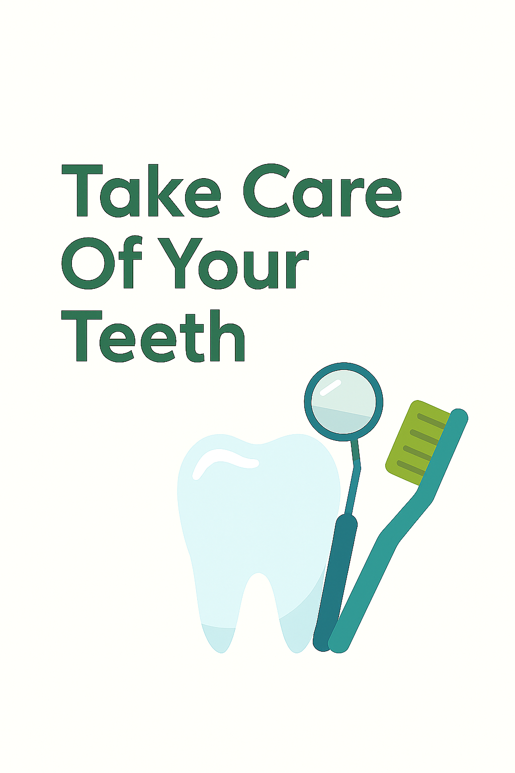Informative graphic promoting dental hygiene, featuring a stylized tooth and dental tools. Ideal for educational content in healthcare and dental practices.