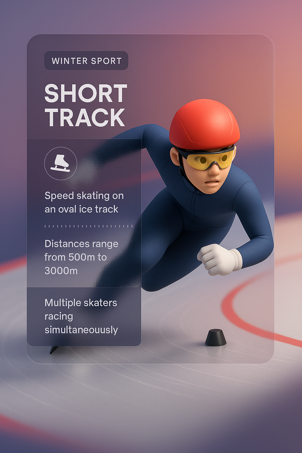 /Collection: /by davooda/Type: PNG/A dynamic 3D illustration of a short track speed skater in action, set against a smooth gradient background. The design features a transparent overlay with key information about the sport, ensuring readability and visual appeal.
