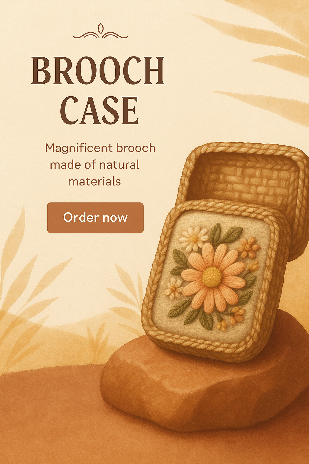 This is a promotional graphic for a brooch case featuring floral designs. It has a warm, earthy color palette and a soft, artistic style, aimed at attracting potential buyers.