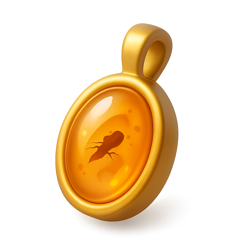 A beautifully crafted 3D icon of amber jewelry featuring a golden pendant with a unique design. The amber showcases a captivating internal detail, all set against a smooth gradient background.