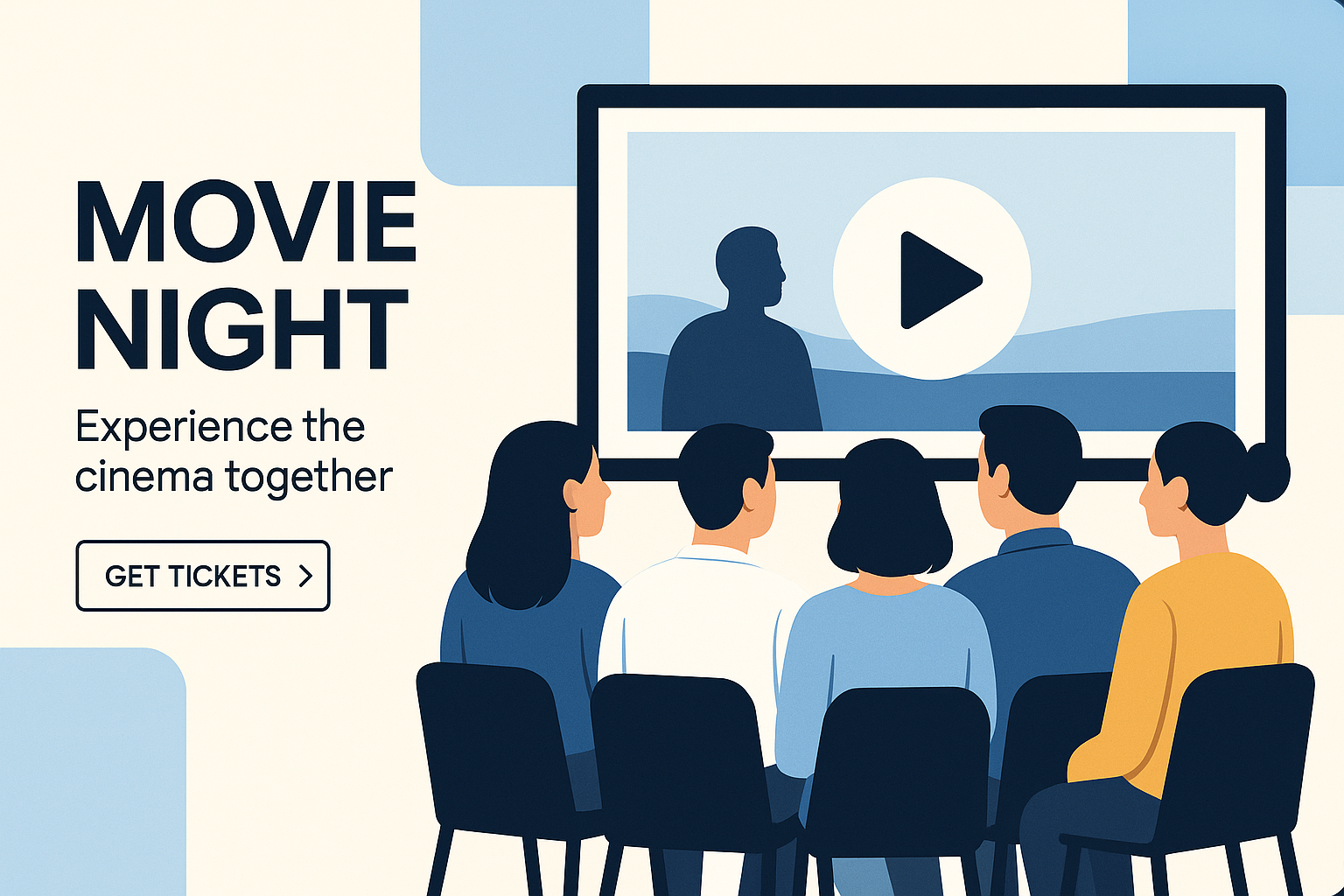 A vibrant illustration depicting a group of people enjoying a movie night, with a large screen showing a play button. The composition is modern and professional, emphasizing community and cinema enjoyment.