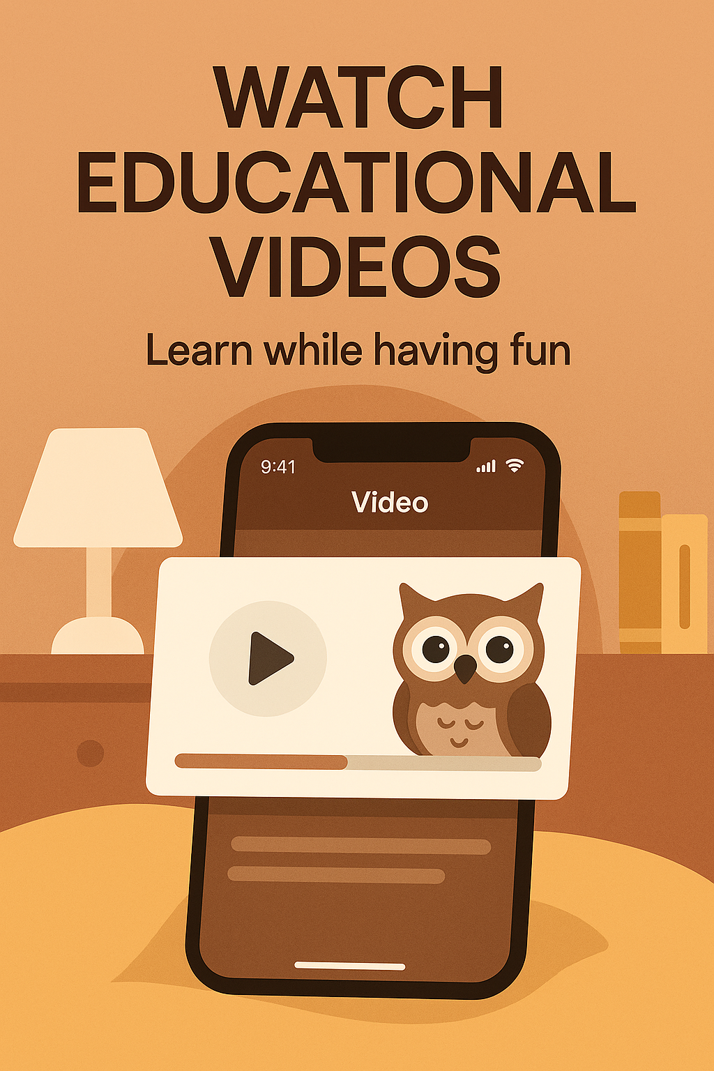 /Collection: /by davooda/Type: PNG/A visually appealing promotional graphic featuring a smartphone displaying an educational video interface. The warm color palette and playful owl character create an inviting atmosphere perfect for attracting viewers to educational content.