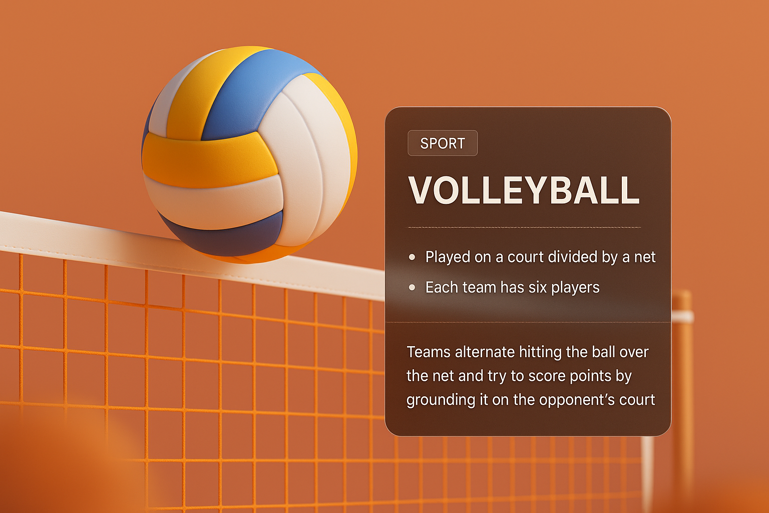 /Collection: /by davooda/Type: PNG/A vibrant 3D illustration of a volleyball on a net, featuring a stylish dark label overlay with text detailing the sport's rules and team structure. The background showcases a smooth gradient.