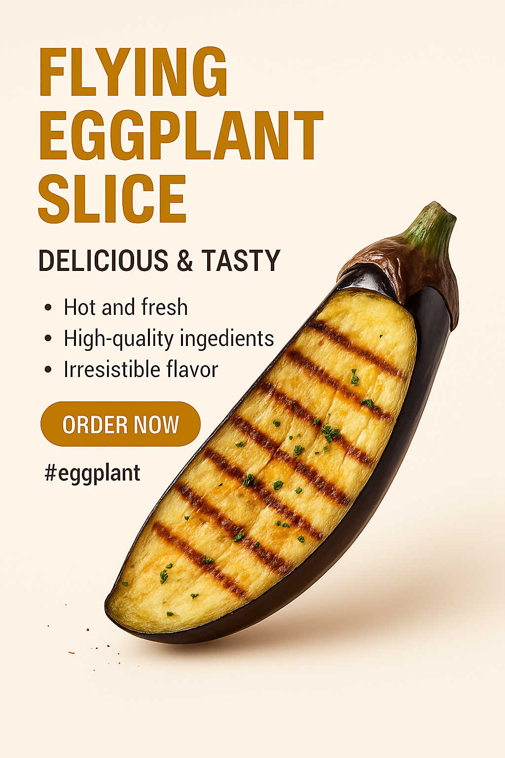 A visually appealing promotional graphic showcasing a grilled eggplant slice, emphasizing its deliciousness and quality. Ideal for food marketing or culinary promotions.