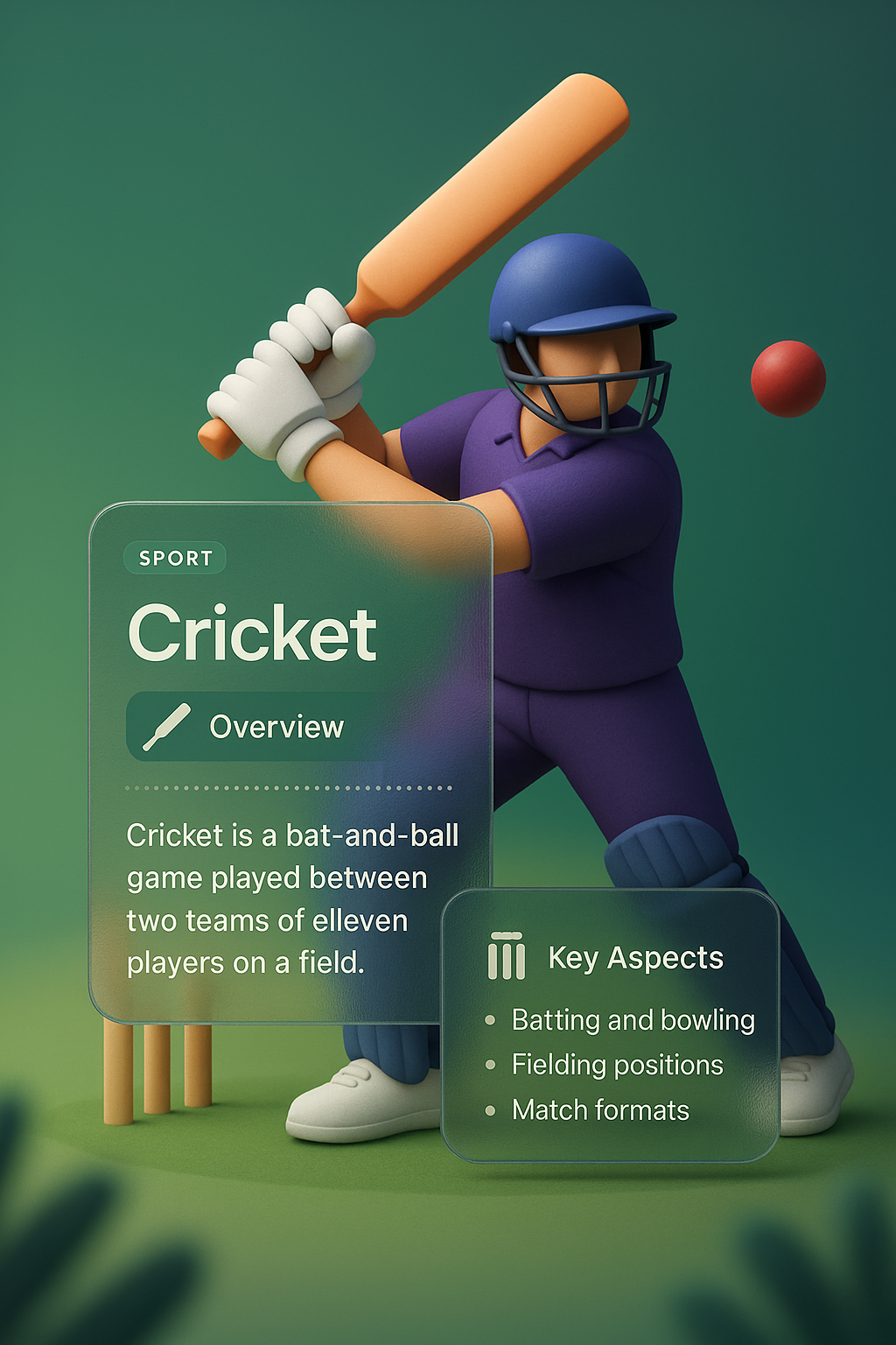 /Collection: /by davooda/Type: PNG/A visually engaging 3D illustration of a cricket player in action, complemented by integrated web design components, including an overview and key aspects of the sport.