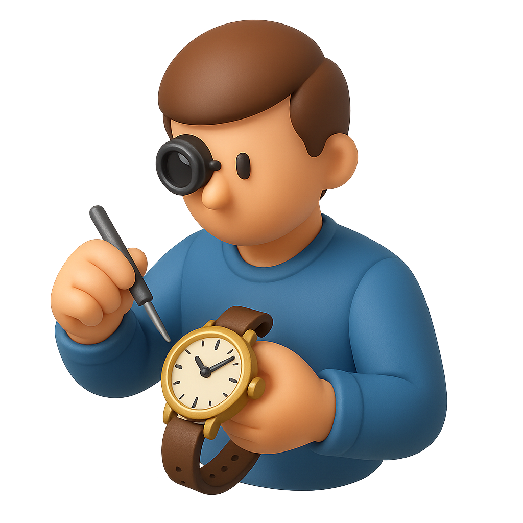 A 3D icon depicting a watch repair technician in a three-quarter view. The character wears a blue shirt and uses a tool to work on a classic wristwatch, showcasing a playful, volumetric design.
