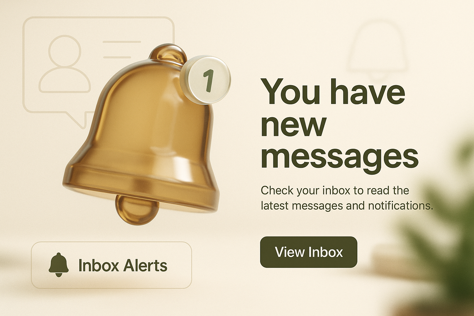 A modern 3D graphic featuring a notification bell icon, designed for digital messaging applications. It conveys new messages and alerts in a sleek, minimalistic style, suitable for app interfaces.