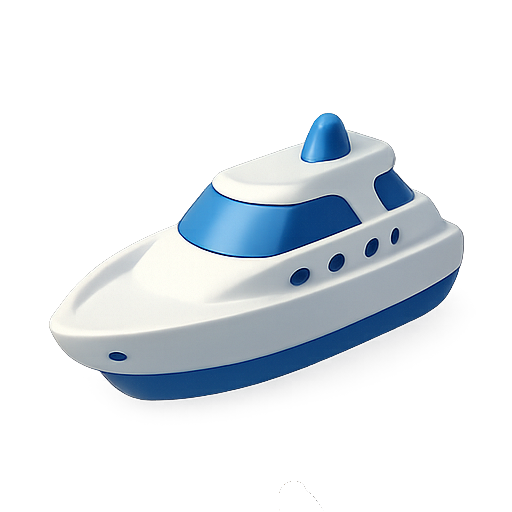 /Collection: /by davooda/Type: PNG/A 3D-rendered illustration of a stylized yacht, featuring a sleek design and a blue and white color palette, ideal for nautical-themed graphics or children's toys.