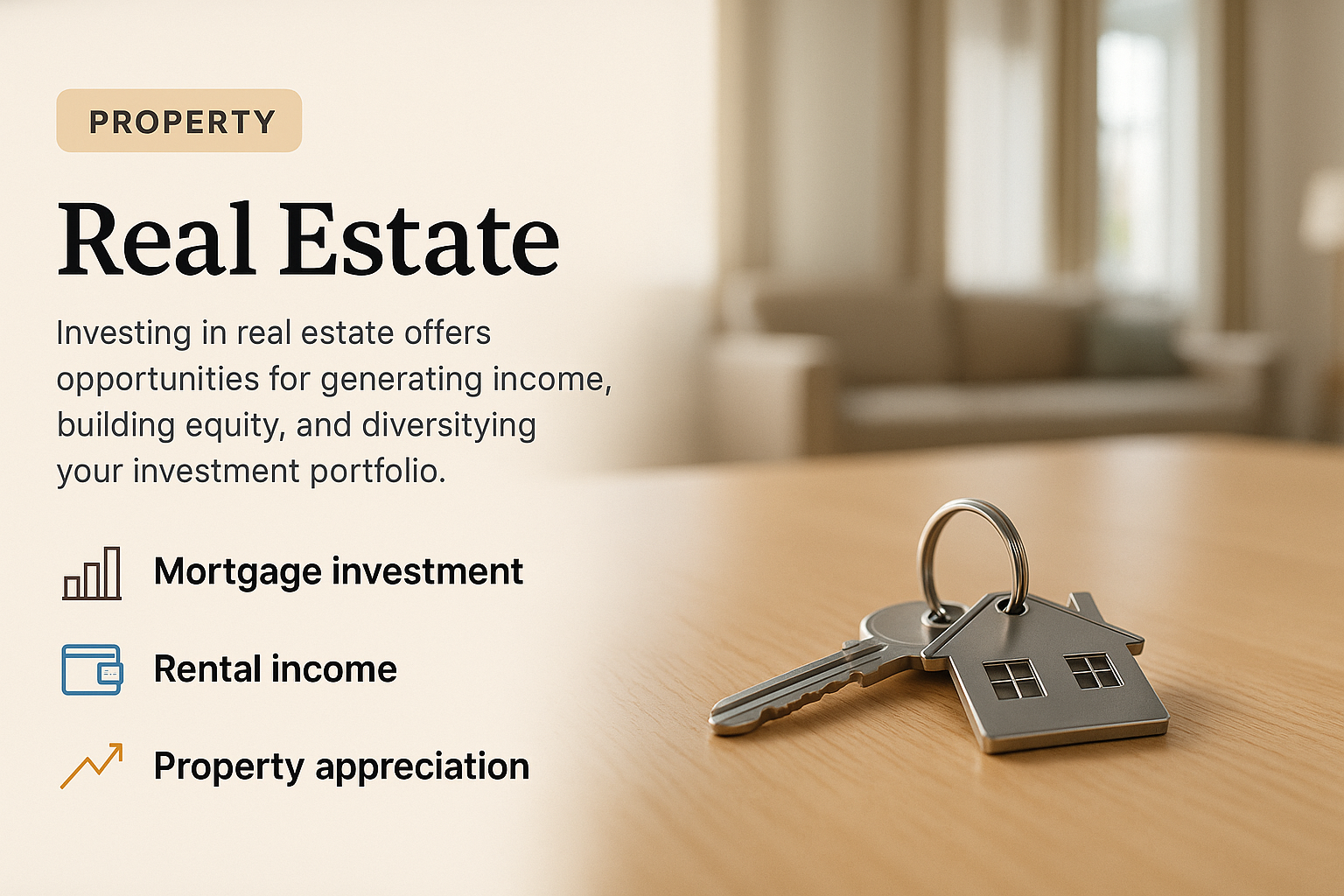 Informative graphic showcasing key benefits of real estate investment, featuring a modern design with property keys and text highlights for educational purposes.