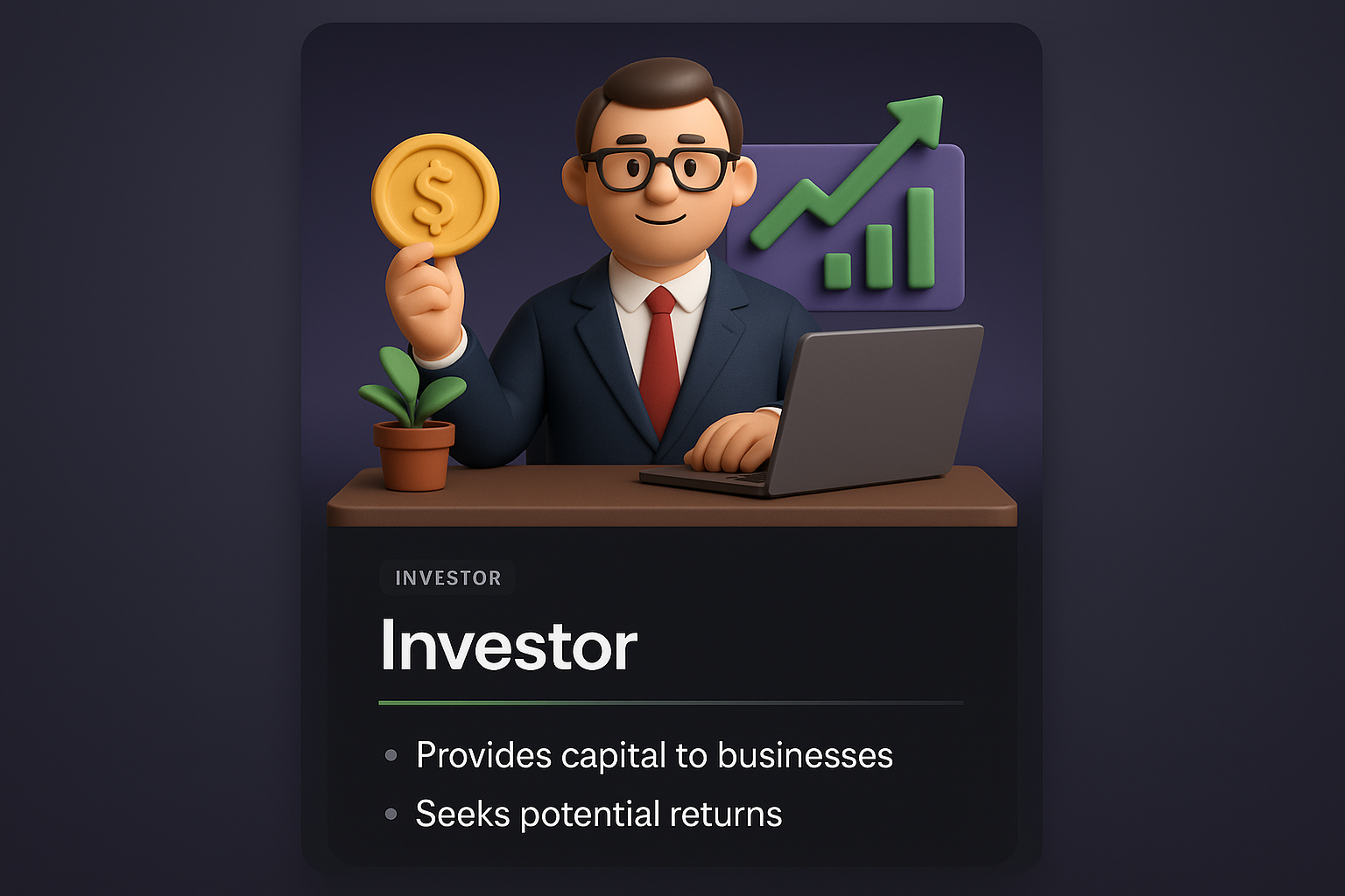 /Collection: /by davooda/Type: PNG/A 3D illustration featuring an investor holding a coin, with a laptop and growth chart. The design includes integrated text blocks and a dark background for a modern look.