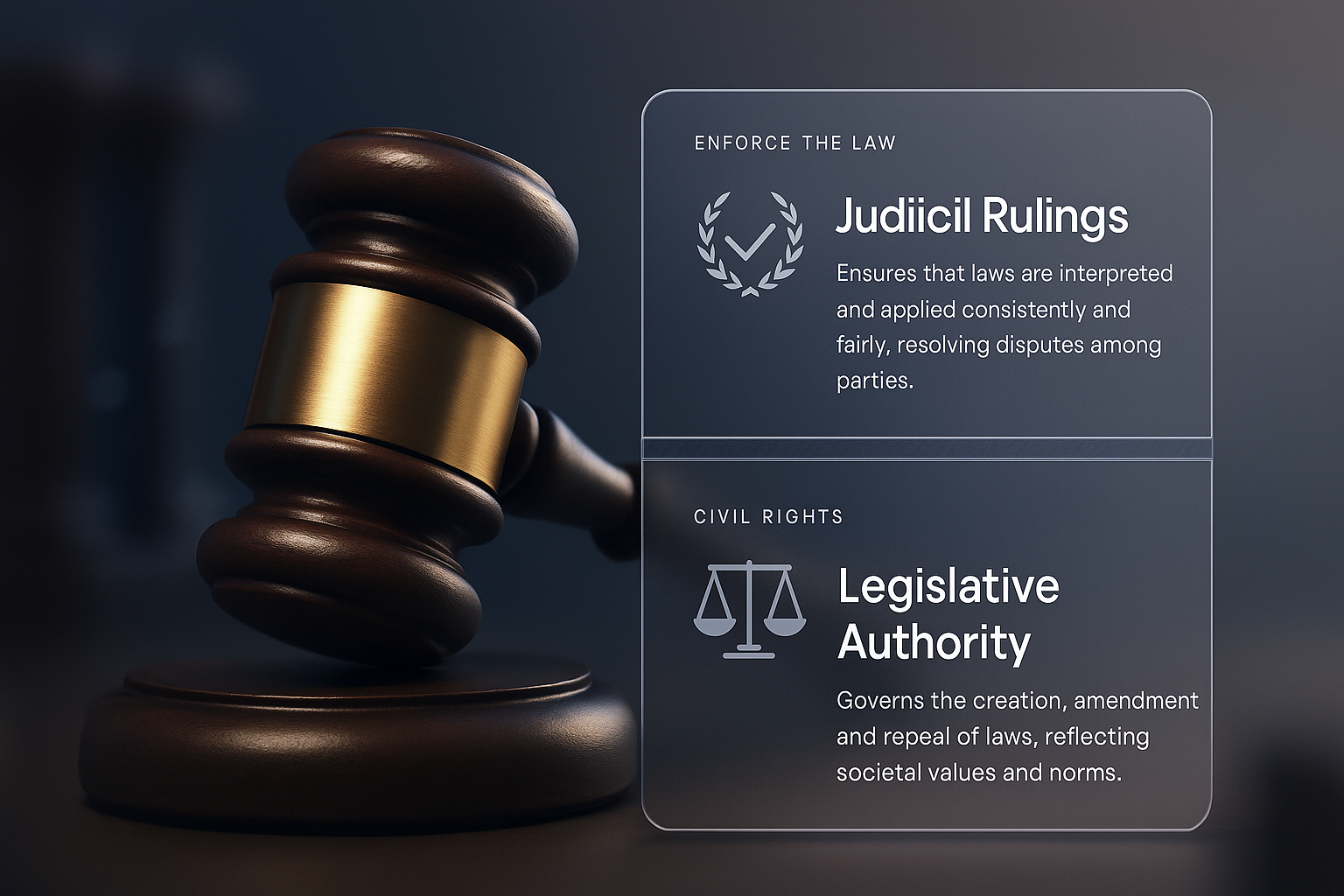 A courtroom gavel symbolizes law and authority, highlighting judicial rulings and legislative power. The design features layered elements for depth and realism.
