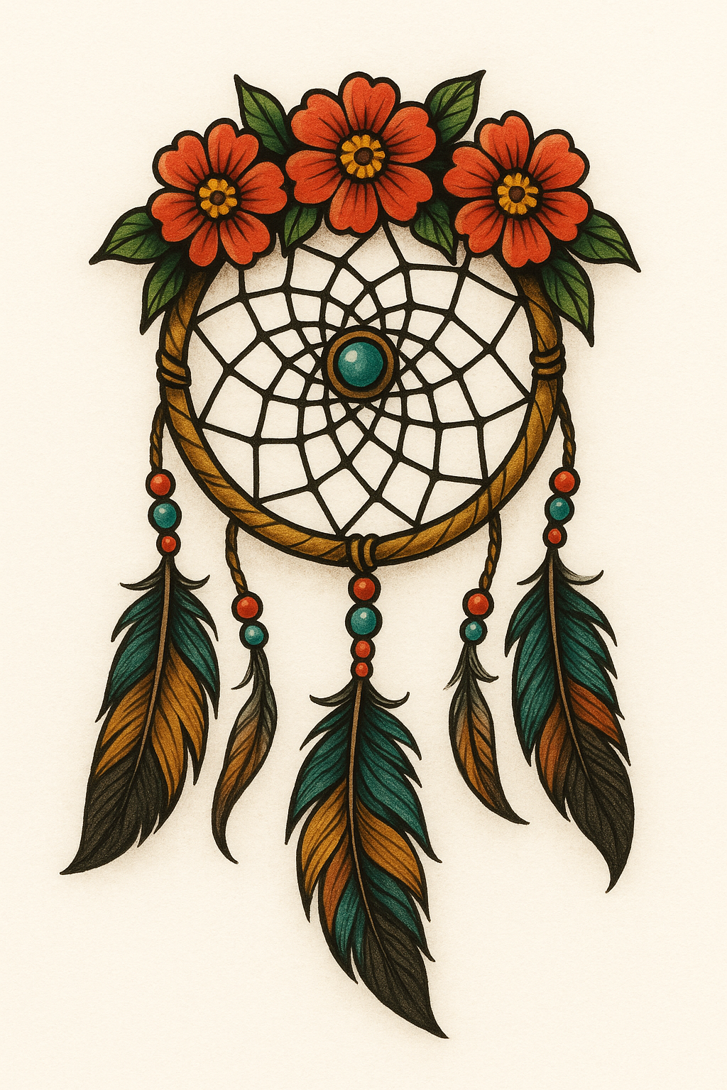 Vibrant and detailed illustration of a dreamcatcher adorned with blooming flowers and feathers, ideal for art prints, tattoos, or decorative purposes.
