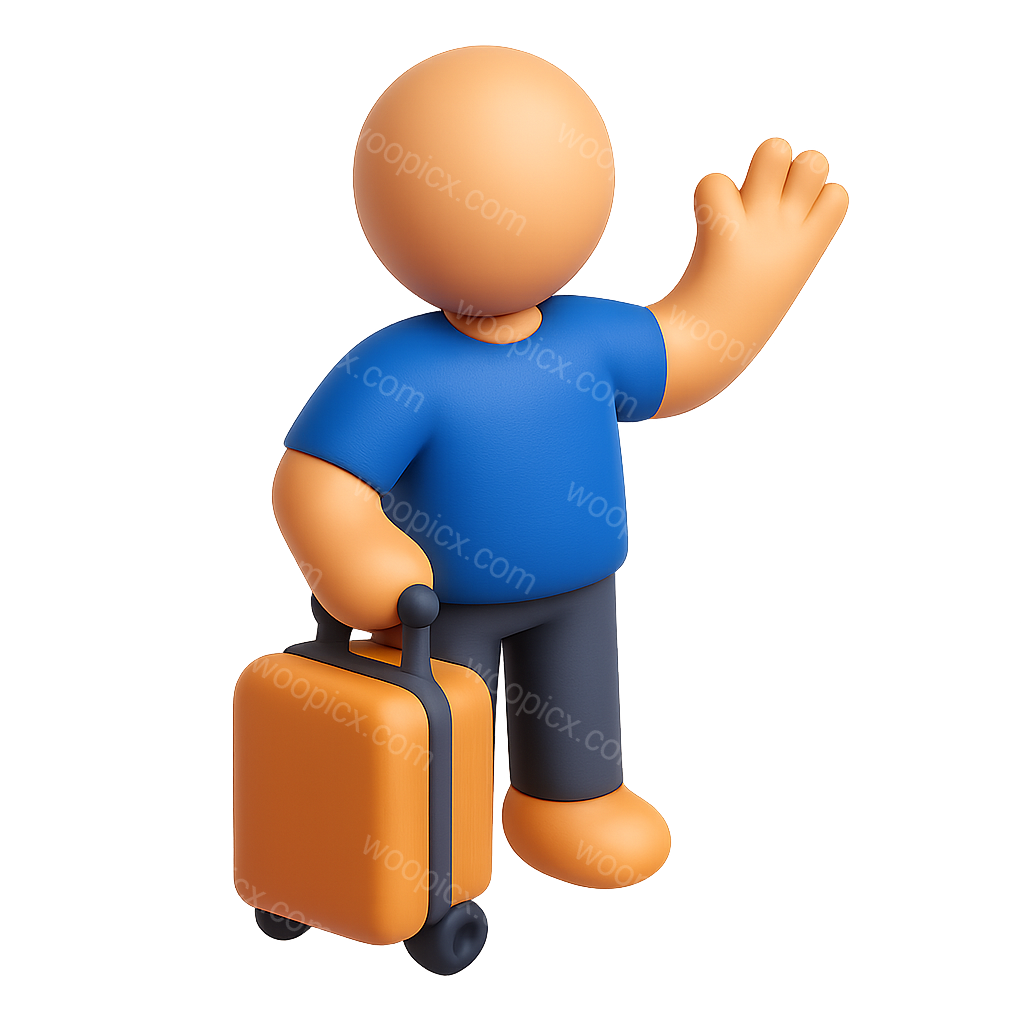 A stylized 3D icon of a person waving while holding a suitcase. The character features a simple design with a blue shirt and orange suitcase, set against a soft gradient background.