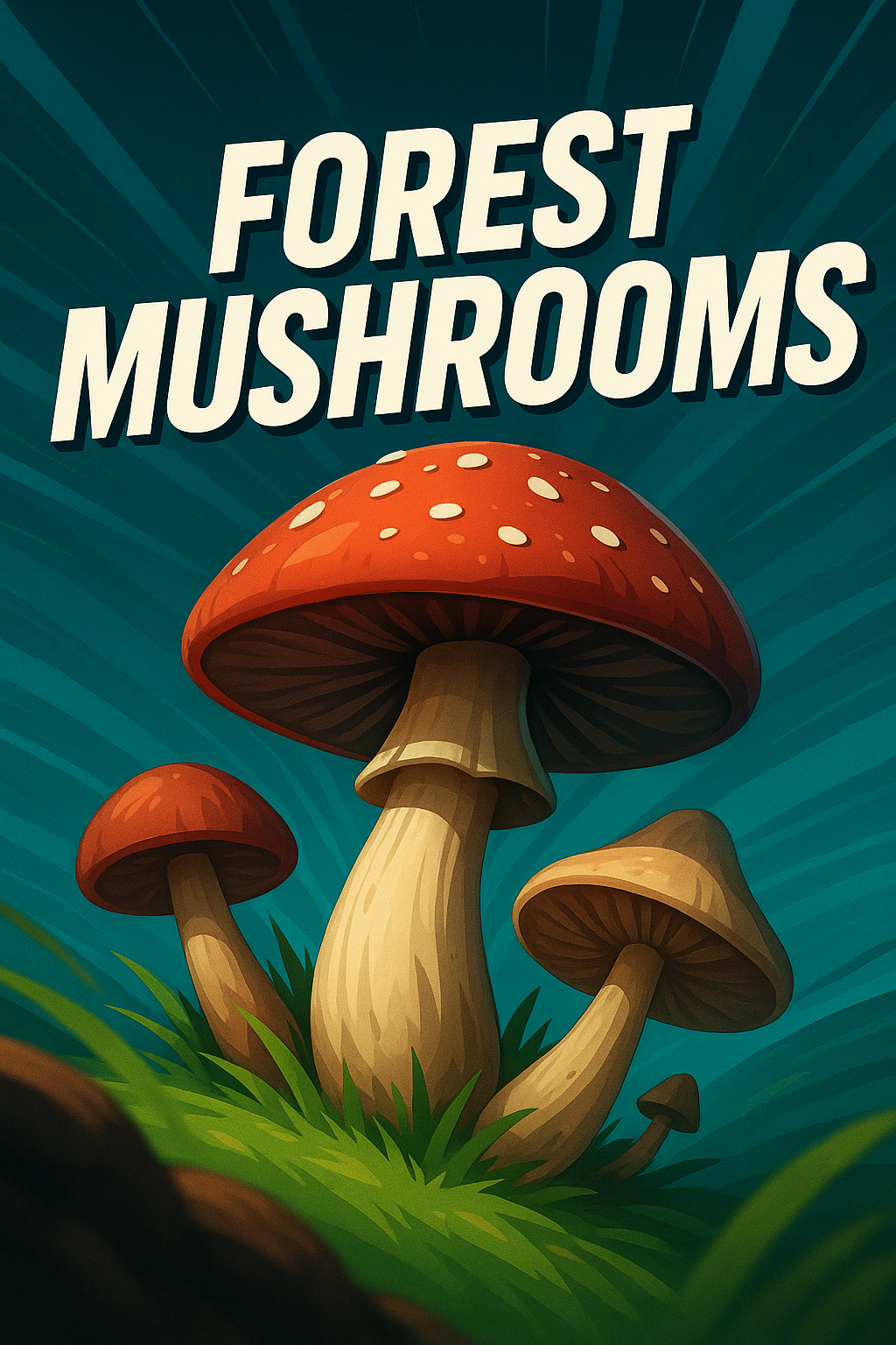 /Collection: /by davooda/Type: PNG/A vibrant illustration featuring various mushrooms in a dynamic forest setting. The bold title captures attention against a gradient backdrop, enhancing the lively atmosphere.