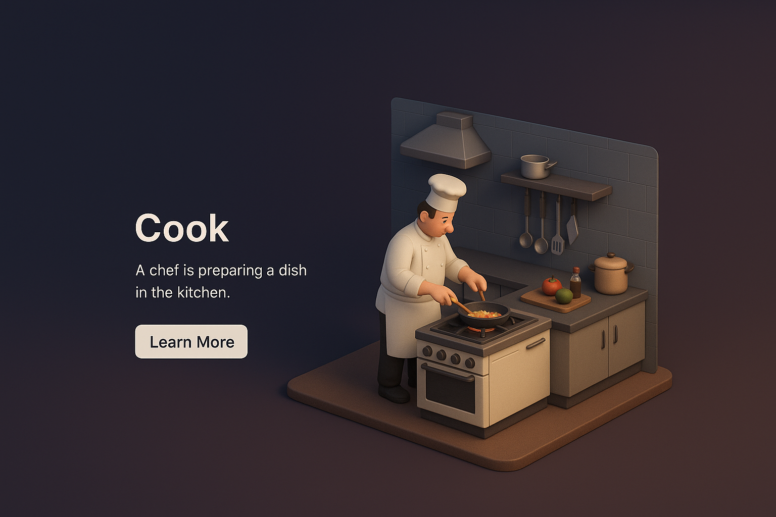 /Collection: /by davooda/Type: PNG/A 3D scene depicting a chef cooking in a kitchen from an overhead perspective. The dark background contrasts with the vibrant kitchen elements, showcasing a realistic style.