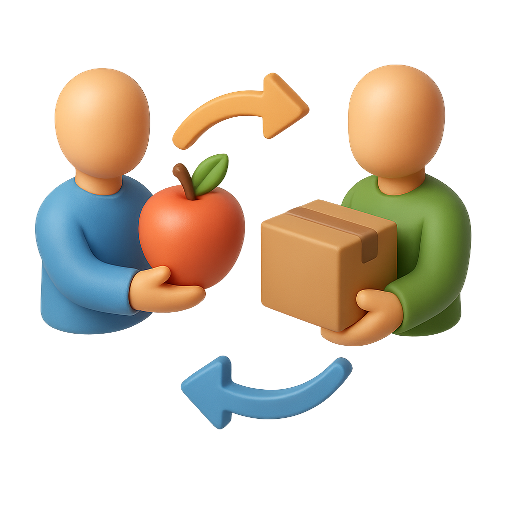 A visually appealing 3D icon depicting two stylized figures exchanging an apple and a package. The design features a transparent background and an isometric perspective for a modern look.