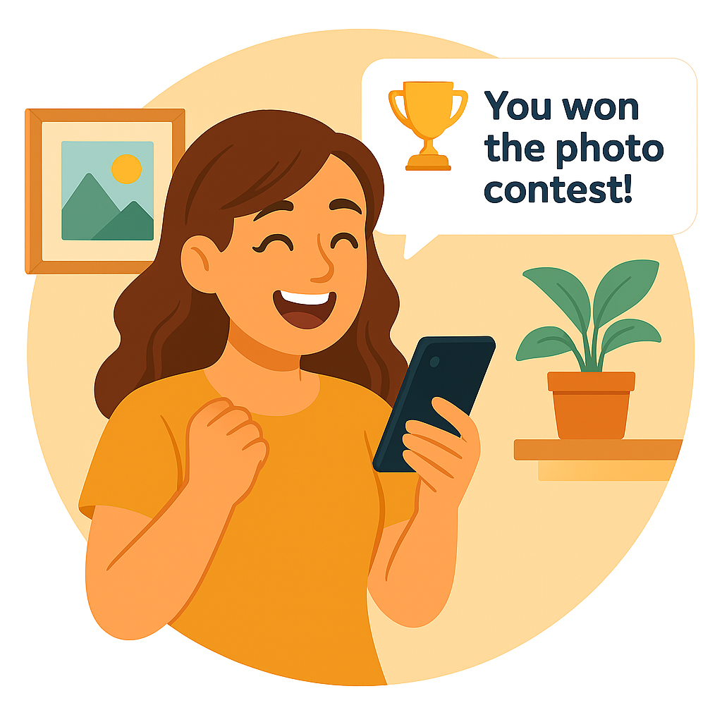 /Collection: /by davooda/Type: PNG/A vibrant and cheerful illustration showcasing a character excitedly receiving news of winning a photo contest. Ideal for social media posts and promotional materials.