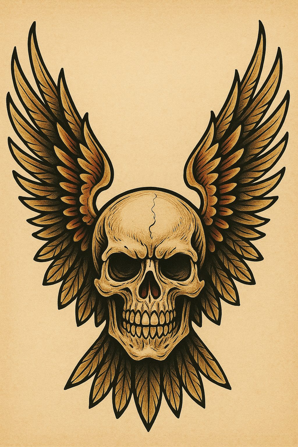 /Collection: /by davooda/Type: PNG/This image features a stylized skull with prominent wings and floral motifs, perfect for tattoo designs or digital art. Its vintage style appeals to alternative culture.