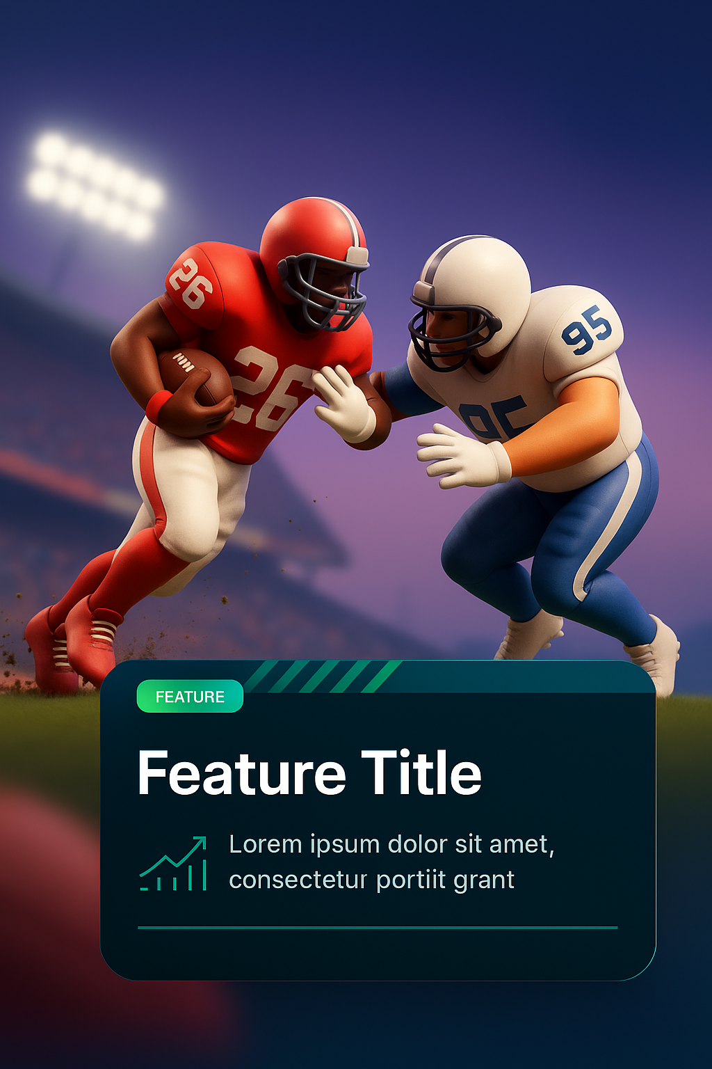A vibrant 3D illustration featuring American football players in action during a Super Bowl game, with a gradient background and an integrated feature block.