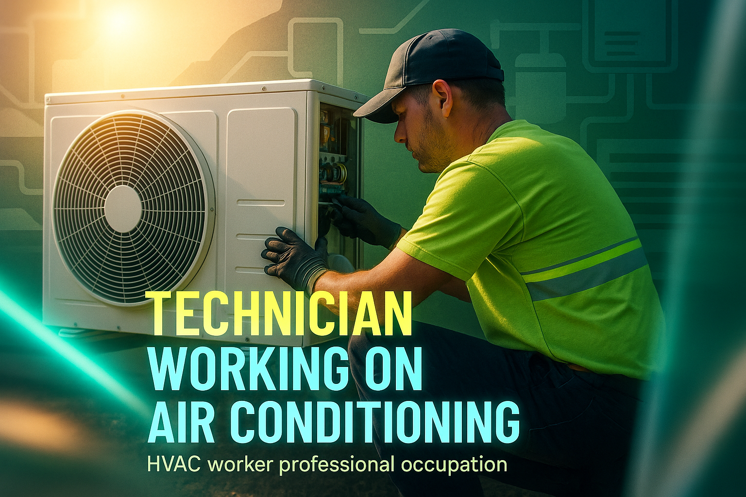 Professional image of an HVAC technician servicing an air conditioning unit, featuring a bright, modern color palette and a focus on the technician's diligent work. Ideal for industry-related content.