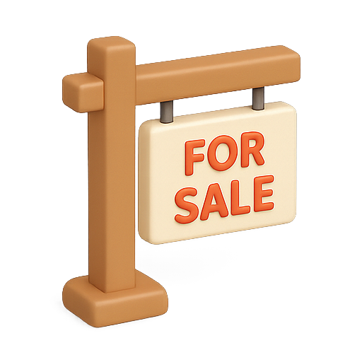 3D icon of a real estate sign featuring a 'For Sale' message. This graphic is ideal for real estate marketing, showcasing properties, or online listings.