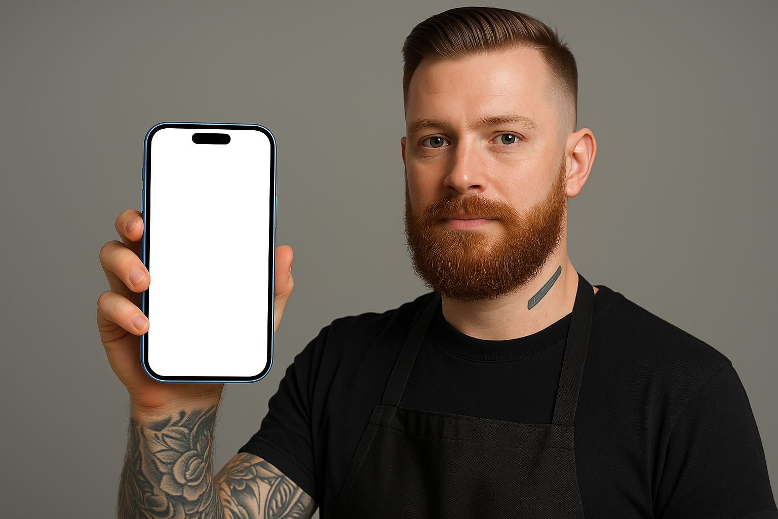 /Collection: /by davooda/Type: PNG/A tattooed barber stands confidently, holding a blue smartphone with a blank screen. His well-groomed beard and stylish haircut complement his black apron, set against a neutral backdrop.