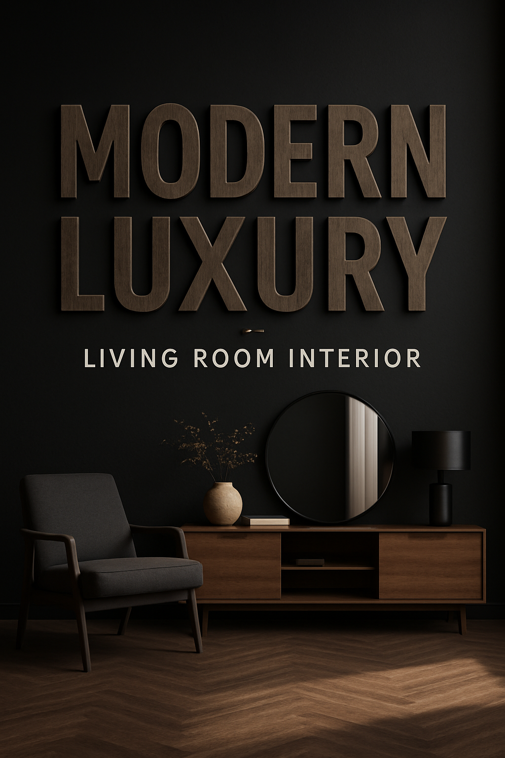 A sophisticated living room interior showcasing modern luxury aesthetics with dark tones, wooden textures, and elegant decor, ideal for interior design inspiration.