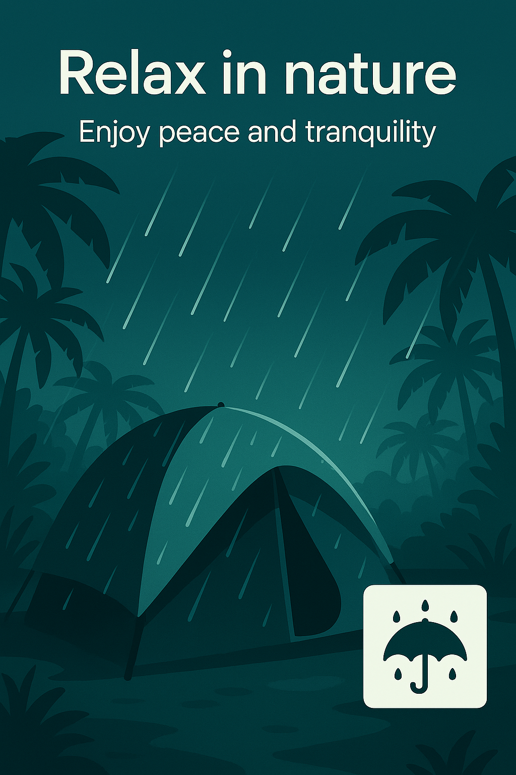 A serene illustration depicting a tent set in a lush, rainy landscape, evoking feelings of peace and tranquility, ideal for promoting outdoor relaxation themes.