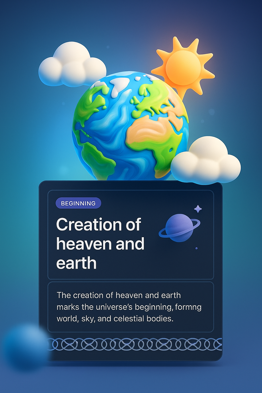 A vibrant 3D illustration showcasing the creation of heaven and earth. Features a globe, sun, and clouds, with a stylish text block integrated into the design.