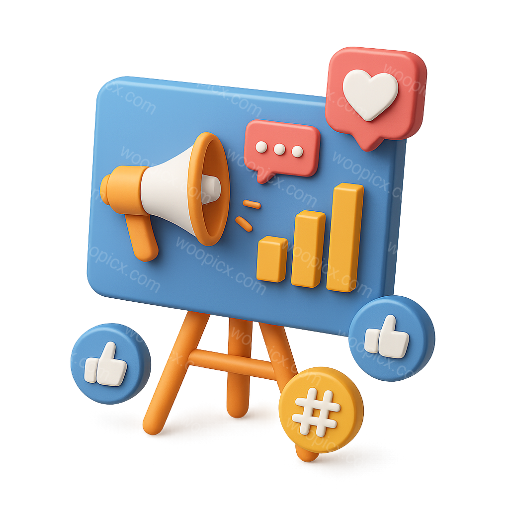 /Premium/Collection: /by davooda/Type: PNG/A vibrant 3D icon representing social media marketing, featuring a megaphone, chat bubbles, and engagement metrics on a board. The design showcases a playful, colorful aesthetic.