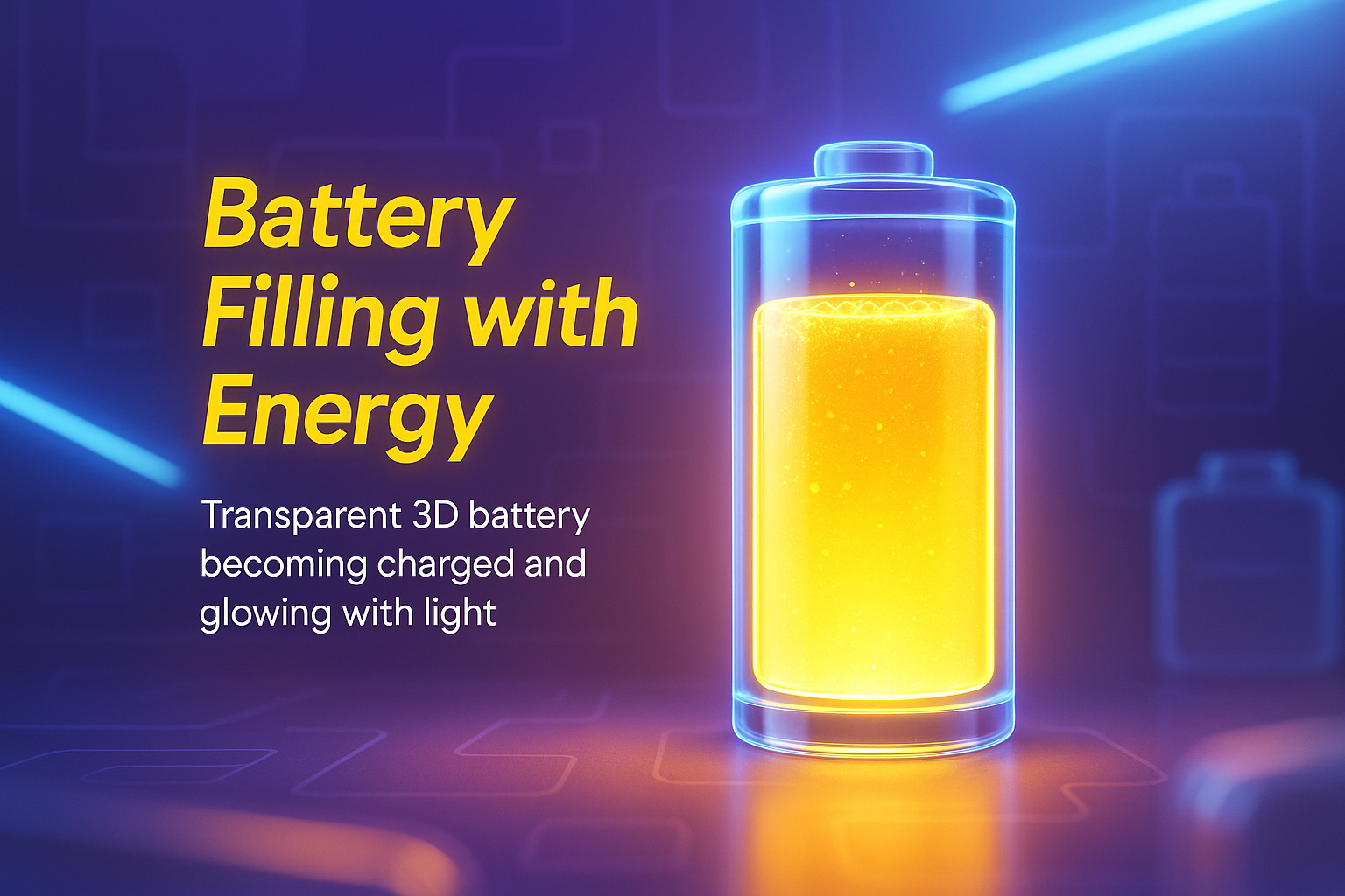 /Collection: /by davooda/Type: PNG/A vibrant 3D illustration depicting a transparent battery filling with energy, enhanced by glowing light effects. Ideal for technology and energy-related content.