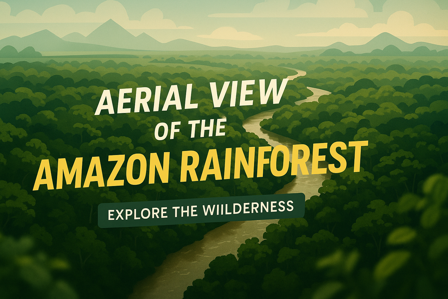 Illustrative graphic depicting an aerial view of the Amazon rainforest, featuring dense greenery and a winding river, ideal for environmental awareness campaigns.