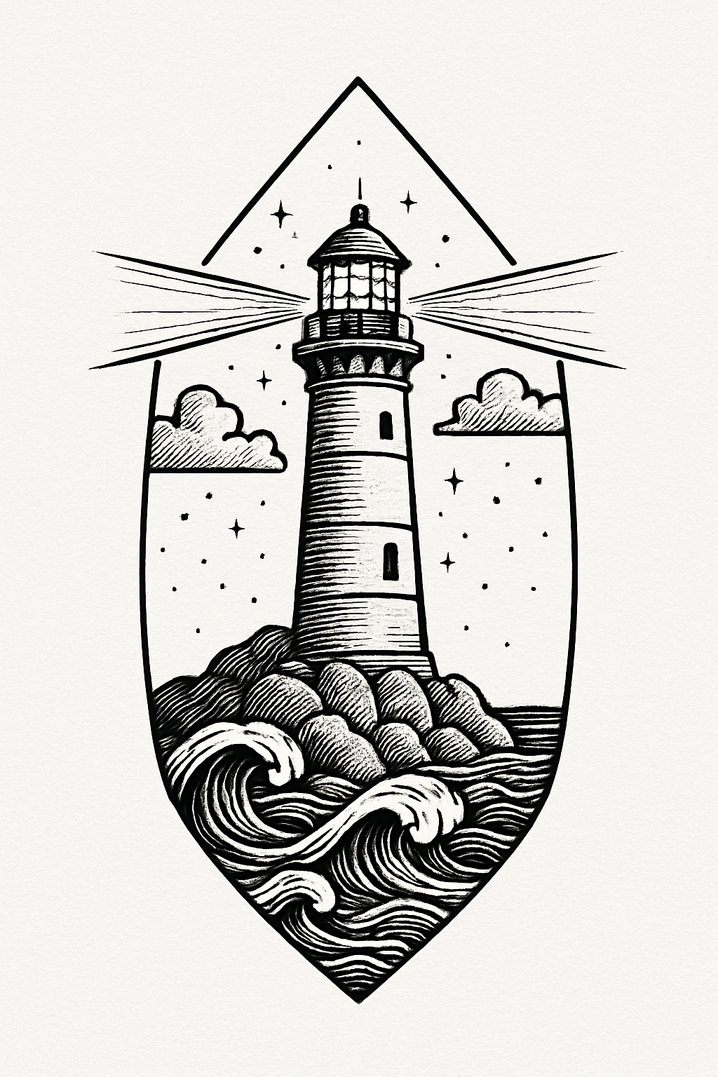 /Collection: /by davooda/Type: PNG/This is a detailed illustration of a lighthouse surrounded by waves and clouds, featuring a vintage design style. Ideal for nautical themes or maritime branding.