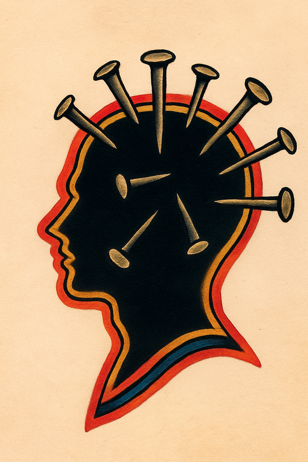 /Collection: /by davooda/Type: PNG/A striking tattoo design showcasing a silhouette of a head with nails protruding from it, set against a light beige background. The colors add depth to the classic tattoo aesthetic.