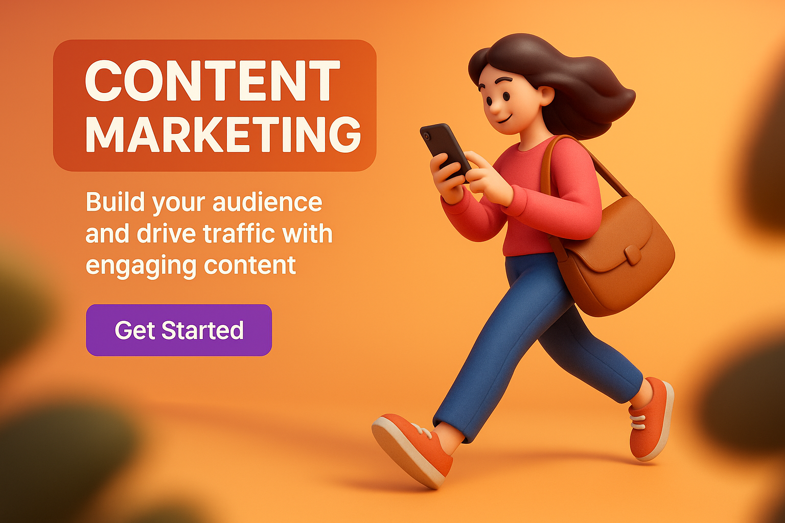 Vibrant 3D illustration featuring a character engaged in content marketing, designed to attract attention for digital marketing campaigns. Ideal for social media and online advertising.
