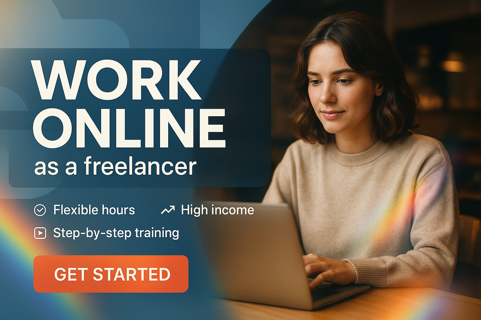 Engaging promotional banner for freelancing opportunities featuring a young professional working on a laptop, designed to attract potential freelancers with a modern aesthetic.