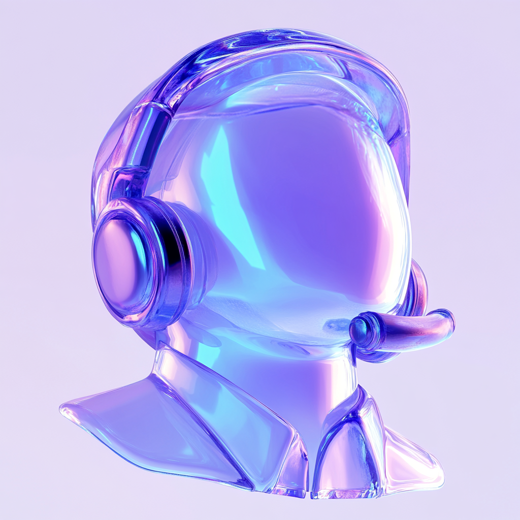 A modern 3D illustration featuring a translucent character wearing a headset, designed with vibrant purple hues. Ideal for tech and gaming-related content.