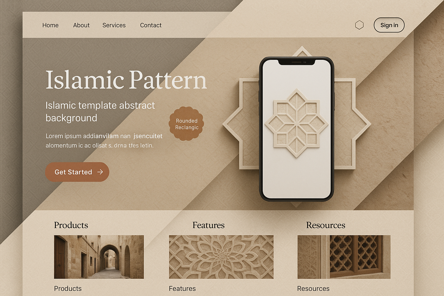 /Collection: /by davooda/Type: PNG/A sophisticated landing page featuring an Islamic pattern theme. The design includes a rounded rectangle mobile display, geometric shapes, and a clean layout with sections for products, features, and resources.