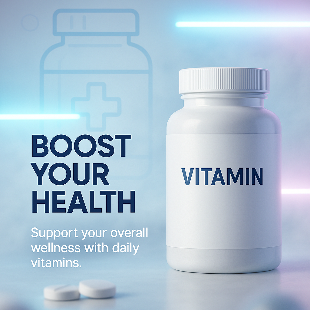 Modern promotional image featuring a vitamin bottle against a soft blue backdrop, designed to encourage health and wellness awareness through daily vitamins.