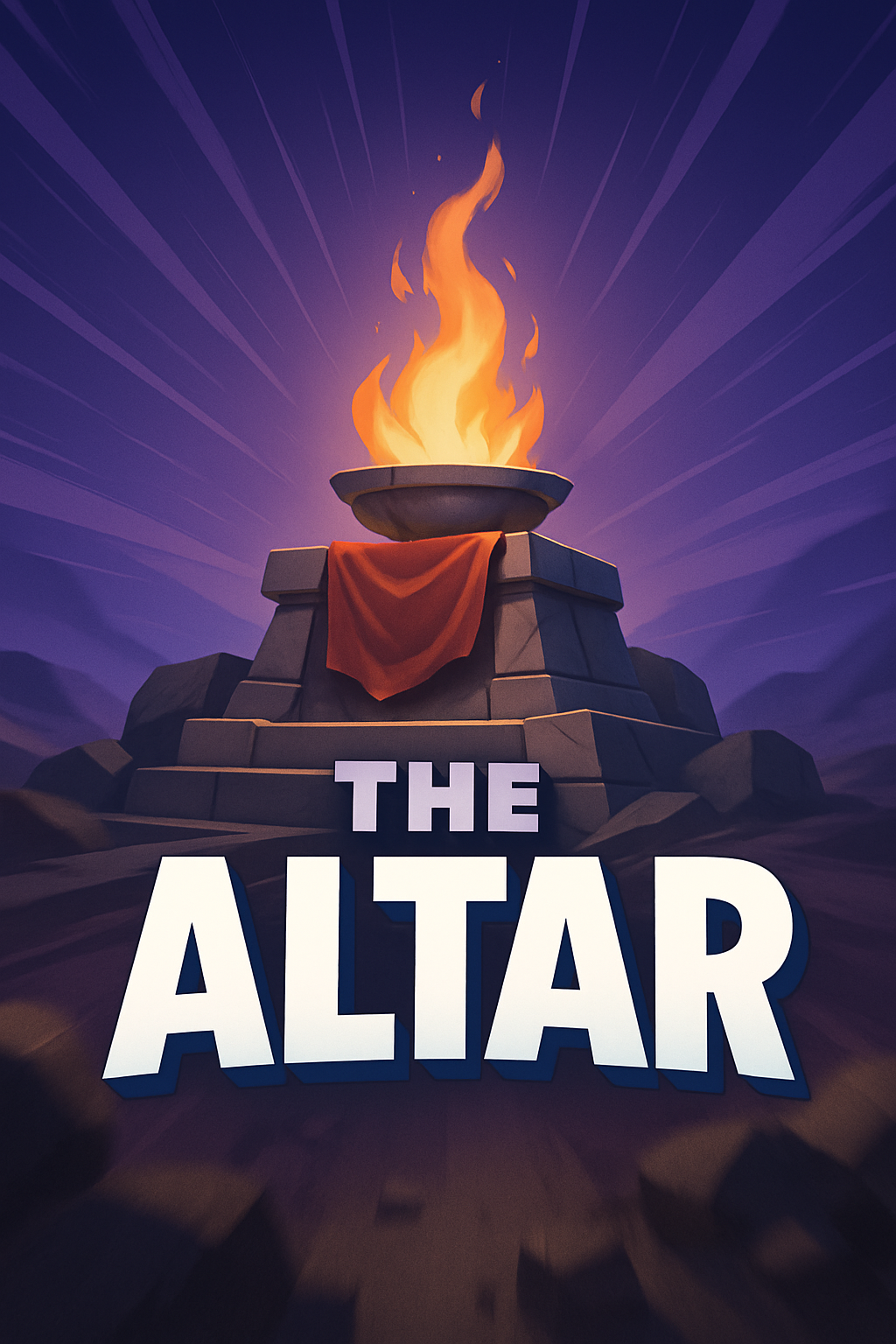 A vibrant and dynamic illustration of an altar featuring flames and bold typography. The design incorporates layered elements with a smooth gradient background, creating a visually engaging composition.