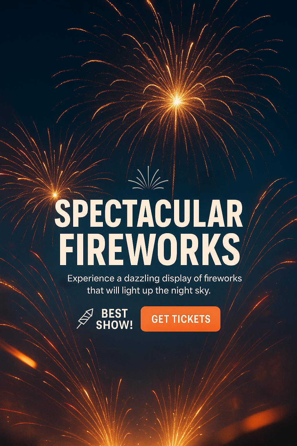 This promotional graphic features a dazzling fireworks display against a night sky. Ideal for event marketing, it uses a bold design to attract attention.